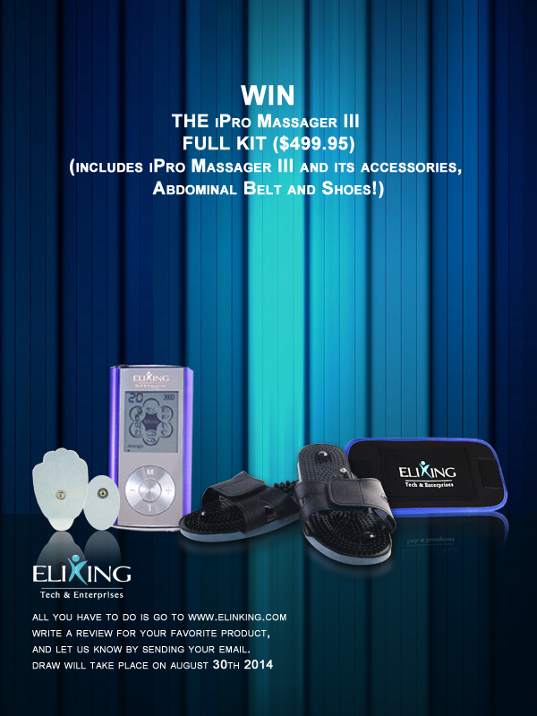 EliKing is giving away one huge prize - the full iPro Massager III Full Kit, that includes the massager itself, with all the connecting cords and pads, iPro Maggager III Shoes and iPro Massager Abdominal Belt. The $499.95 iPro Massager Full Kit can be yours!